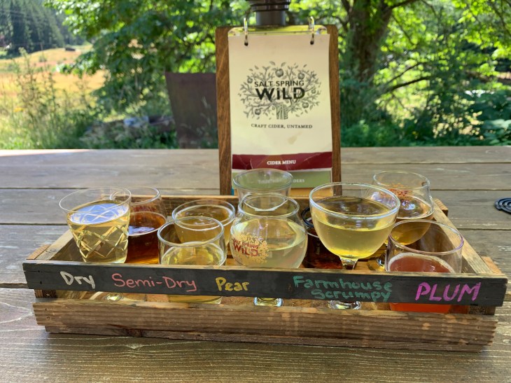 After a few stops, we arrived at Long Harbor on Salt Spring Island (in the Canadian Gulf Islands). It is a breathtaking island. Our first stop, Salt Spring Cider Company, was both beautiful and delicious. We tried the full cider flight, lamb sausages, and cheese. The only miss: the “pickled” carrot ribbons which tasted like wet lavender (soooo gross). The drier ciders were especially interesting, and sitting outside in the shade of a picnic table umbrella on a sunny day, overlooking the meadow (sheep and goats below, birds above), was spectacular.